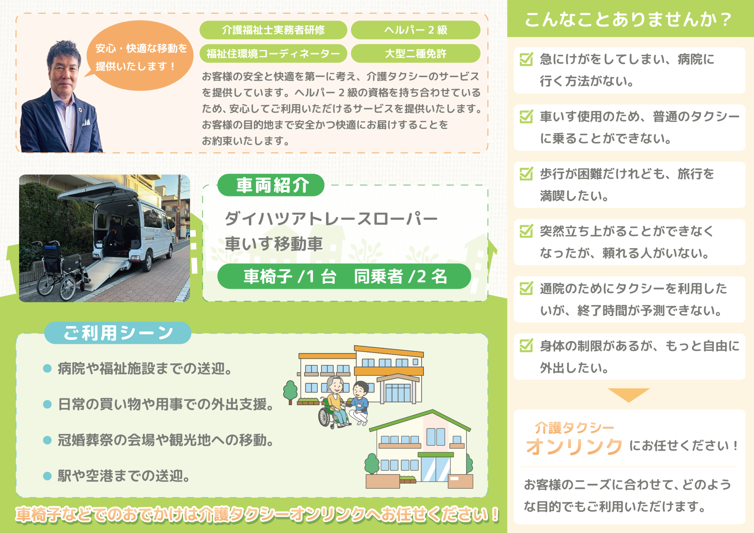 外出が不安な方や、移動手段にお困りの方に寄り添い、安心・快適な移動をサポートいたします。